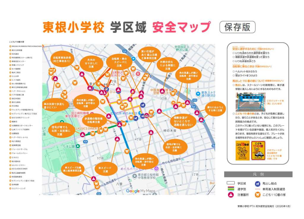 保護者による安全パトロールにより報告された通学路の危険個所などを、「学区域安全マップ」にまとめています。通学路のルートや危険個所など、お子さんとの確認にご活用ください。