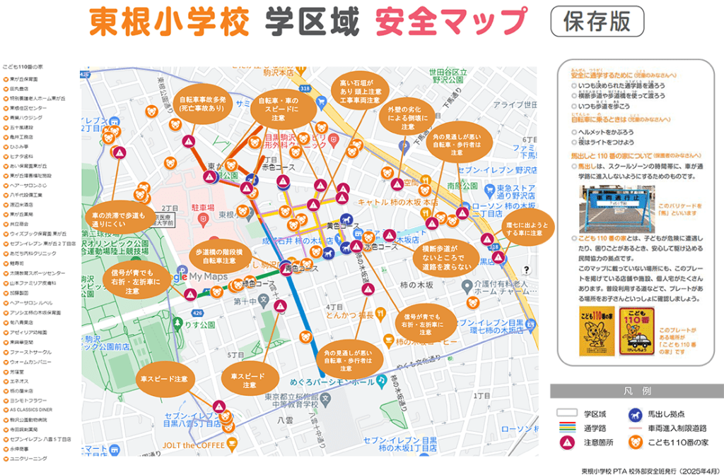 保護者による安全パトロールにより報告された通学路の危険個所などを、「学区域安全マップ」にまとめています。通学路のルートや危険個所など、お子さんとの確認にご活用ください。