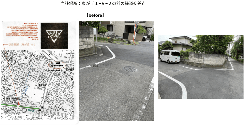 この場所は自転車が一時停止せずに坂を下ってくることが多く、過去には歩行者との接触事故も発生しており、安全パトロールの中でも注意喚起が行われていた箇所です。
