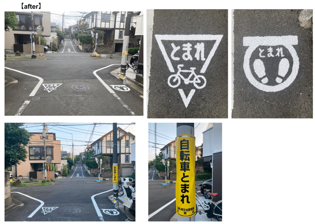 ご報告を受けて、5月15日に目黒区道路公園サービス事務所へ相談したところ、6月13日に路面標示の舗装が完了し、「自転車とまれ」の巻き看板も設置されました。